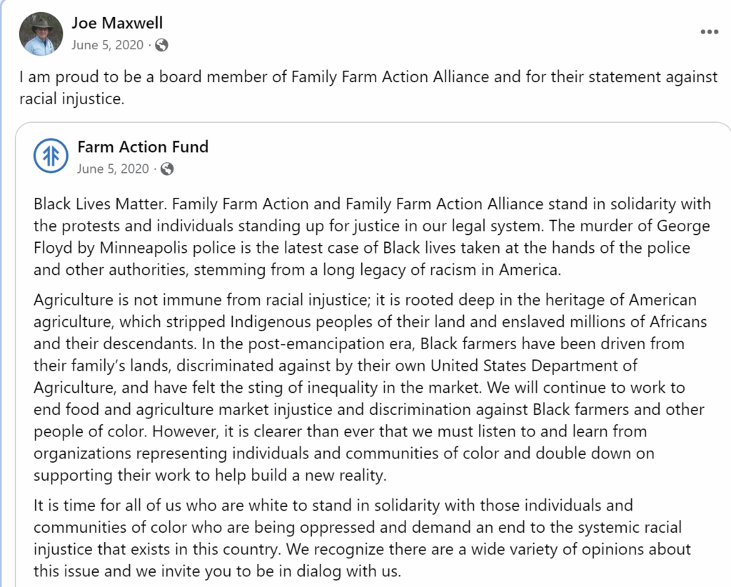 Farm Action even posted an endorsement of “Black Lives Matter,” saying they “stand in solidarity with the protests…”
